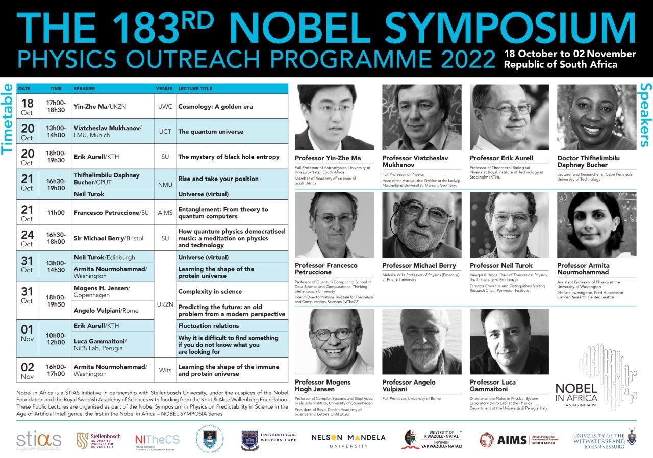 The first Nobel Symposium held in Africa was hosted at STIAS from 18 October to 2 November 2022 in the area of Physics. Public Lectures were organised as part of the symposium, titled the NOBEL SYMPOSIA SERIES. These were presented on several campuses across South Africa. NITheCS assisted with this outreach programme.