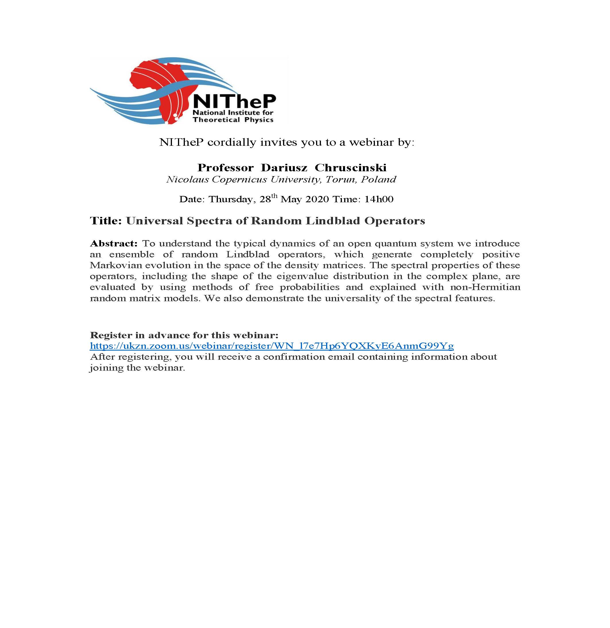 NITheP Colloquium ‘Universal spectra of random Lindblad operators’